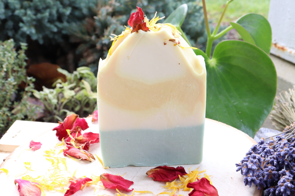 This soap is crafted with love for the gardener and garden lover alike. Made with a nourishing oil infusion of rose petals, lavender, calendula, rosemary and more! The bottom green layer of the soap contains French Green Clay which has deep cleansing and gentle exfoliation benefits. This soap was inspired by the timeless story of the Secret Garden by Frances Hodgson Burnett. Decorated with rose petals and Calendula.